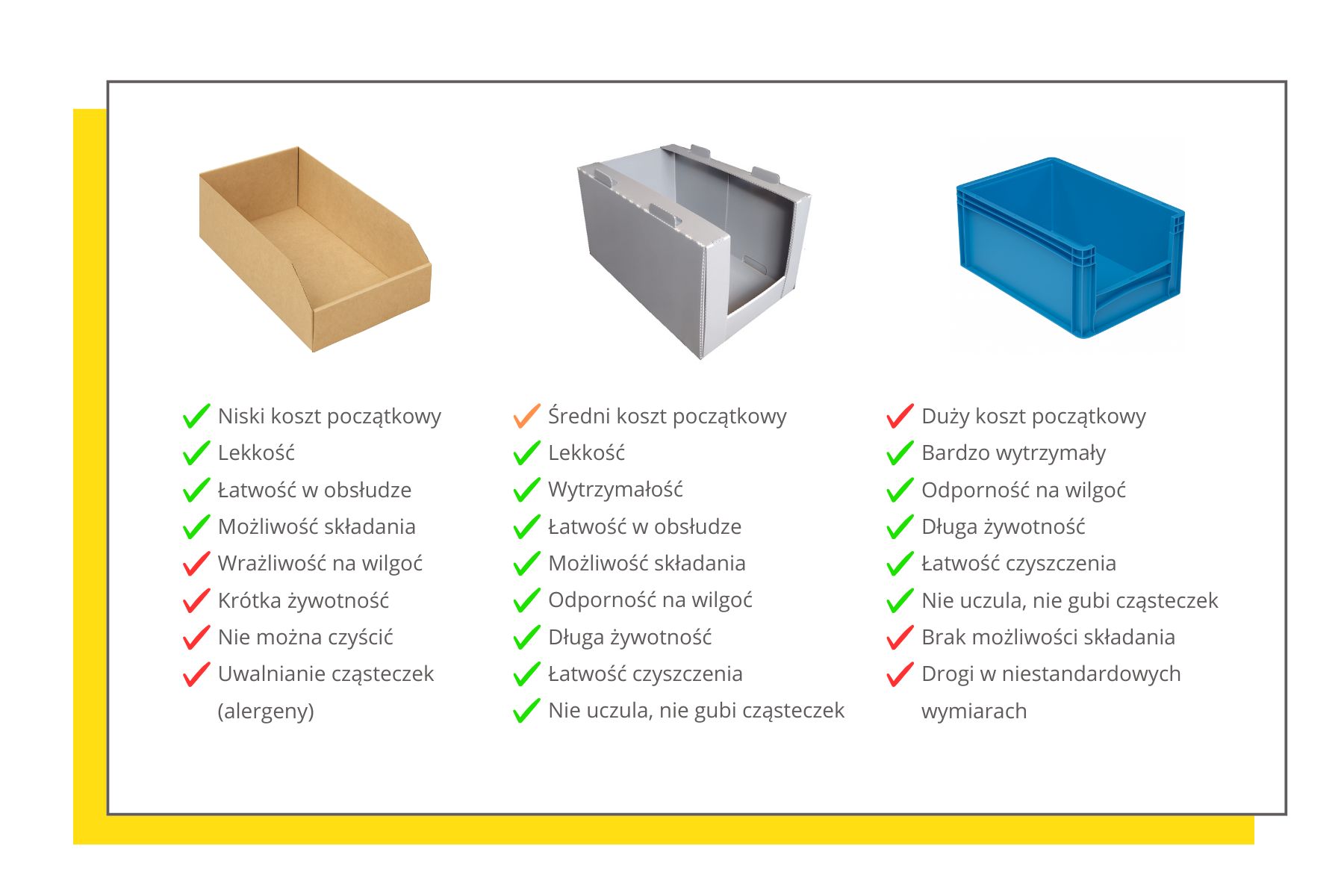 Wytrzymałe, są odporne na zgniatanie, uderzenia oraz zużycie pomimo intensywnego użytkowania, zapewniają nośność i ochronę dla różnych typów produktów.